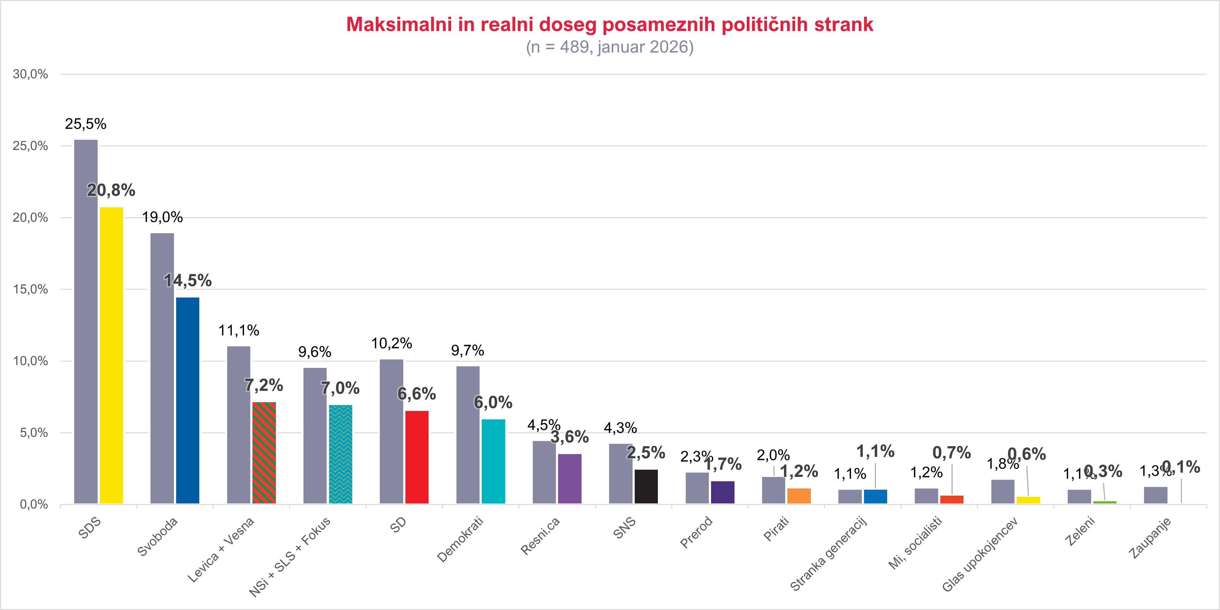 Anketirance smo vprašali tudi, o katerih strankah razmišljajo. Vseh prvih 6 strank po vrsti ima še nekaj potenciala, ki ga lahko do volitev izkoristi za boljšo uvrstitev. Dobro tretjino opredeljenih jih tako razmišlja o SDS, dobro četrtino o Svobodi, med 13 in 15 % opredeljenih pa o naslednjih 4 listah in strankah. Maksimalni domet stranke Resni.ca in SNS je pri slabih 6 % opredeljenih, druge stranke pa se ne približajo parlamentarnemu pragu.