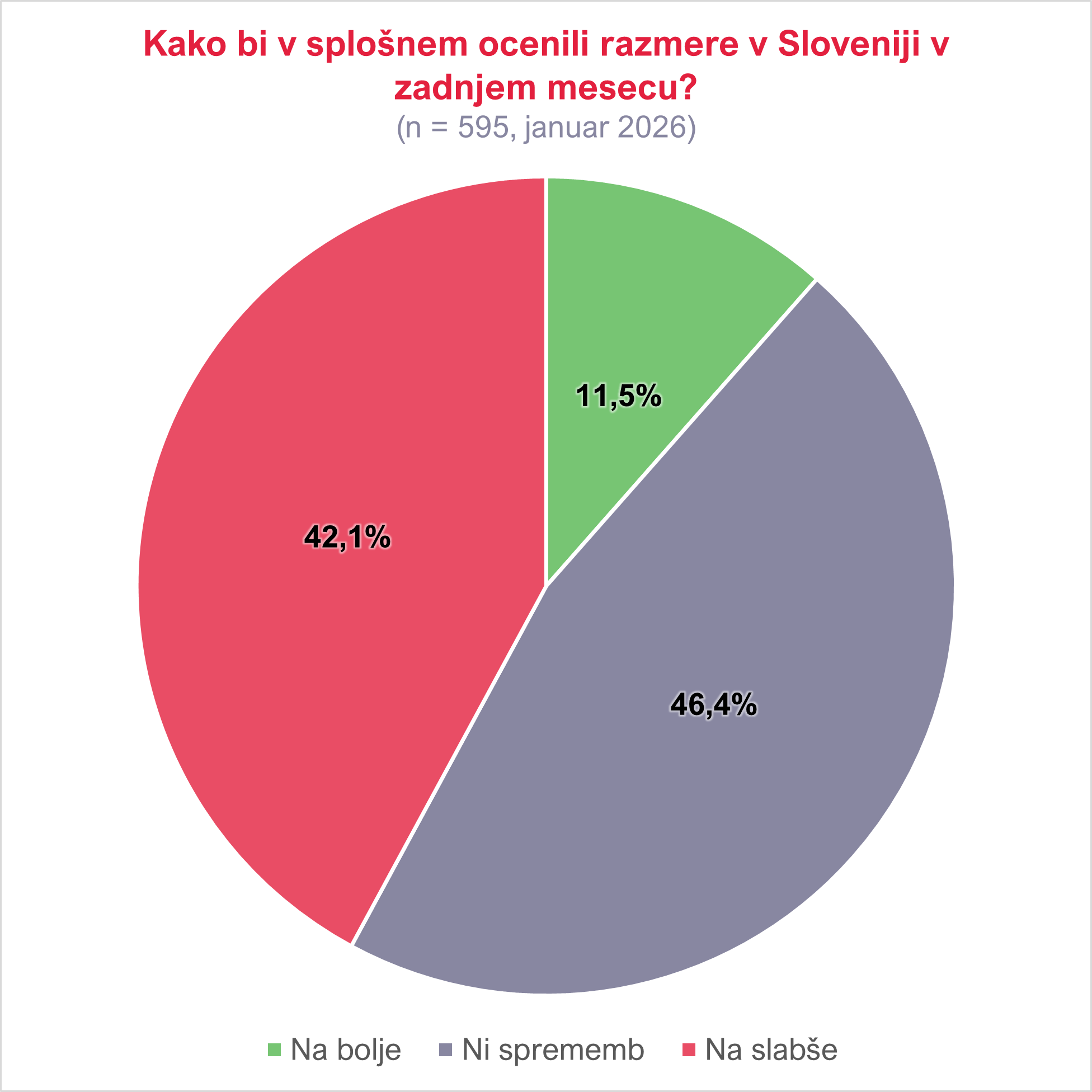 Anketirance smo tako kot vsak mesec vprašali, kako bi v splošnem ocenili razmere v Sloveniji v zadnjem mesecu. 46,4 % vprašanih sprememb ni opazilo, med tem ko jih 42,1 % meni, da se razmere poslabšujejo. Izboljšanje jih je občutilo le 11,5 % vprašanih.