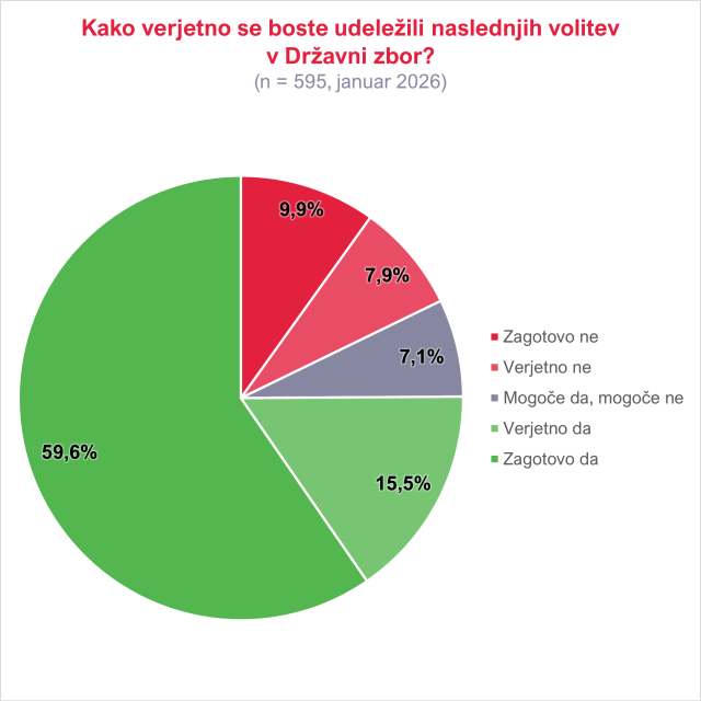 Delež tistih, ki se volitev ne bodo udeležili, je še nekoliko padel. Z napovedjo “zagotovo ne” je na vprašanje o udeležbi na volitvah odgovorilo 9,9 % vprašanih, z “verjetno ne” pa še dodatnih 7,9 %. Odgovora “zagotovo da” in “verjetno da” jih je skupaj izbralo 75,1 %.
