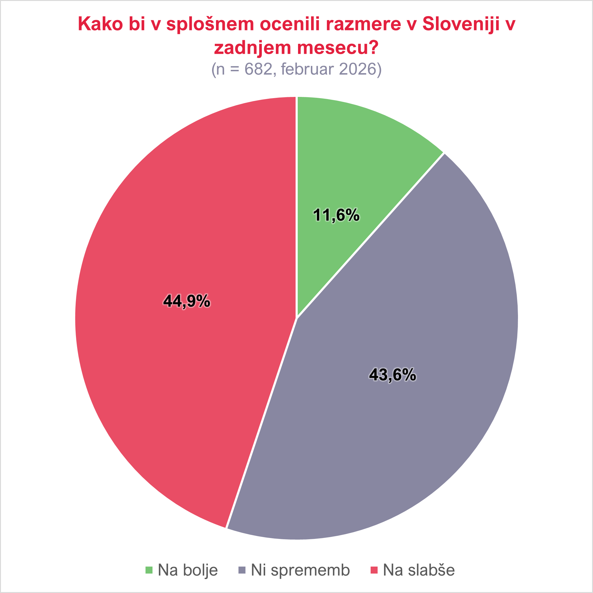 Anketiranci so ponovno ocenjevali razmere v Sloveniji v zadnjem mesecu. 43,6 % vprašanih sprememb ni opazilo, medtem ko jih 44,9 % meni, da se razmere poslabšujejo. Izboljšanje je občutilo le 11,6 % vprašanih. Podatki so primerljivi, kot v prejšnjem mesecu.