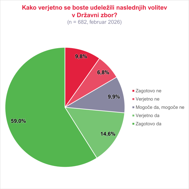Z napovedjo “zagotovo ne” je na vprašanje o udeležbi na volitvah odgovorilo 9,8 % vprašanih, z “verjetno ne” pa še dodatnih 6,8 %. Odgovora “zagotovo da” in “verjetno da” jih je skupaj izbralo 73,6 %.