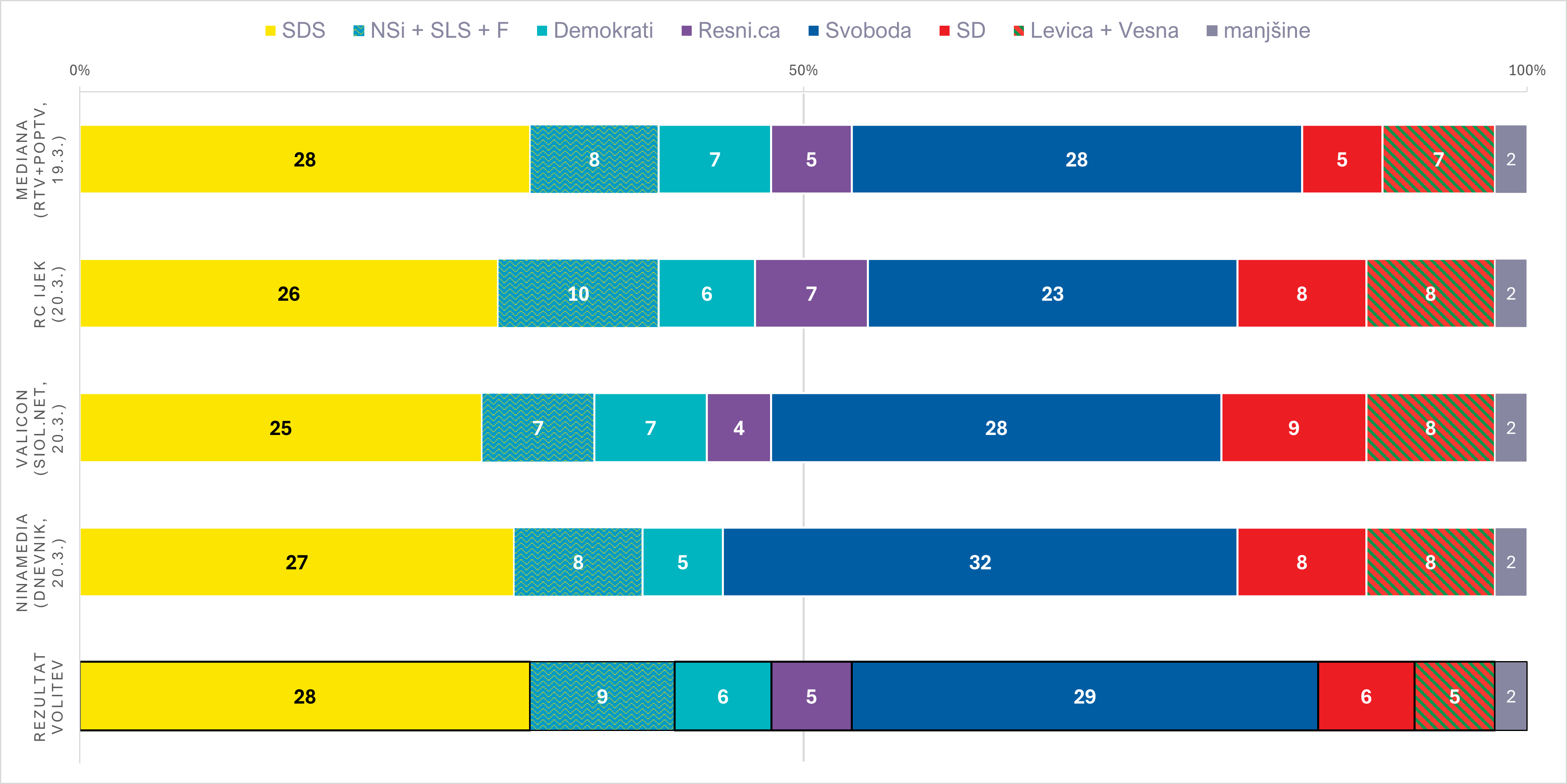 Najbližje rezultatu volitev je bila raziskava Mediane, ki je točno zadela št. mandatov za SDS in stranko Resni.ce ter skupno število opozicijskih (SDS, NSi, SLS, Fokus, Demokrati – 43 mandatov) in koalicijskih strank (Svoboda, SD, Levica, Vesna – 40 mandatov). Pri rezultatih za druge stranke, z izjemo Levice in Vesne, je raziskava pokazala odstopanje za 1 sedež. Glede na sorodnost programov strank lahko ocenjujemo, da se je en mandat od Demokratov prelil k skupni lsiti NSi, SLS, Fokus, po en mandat pa od Levice k SD in od Levice k Svobodi.
